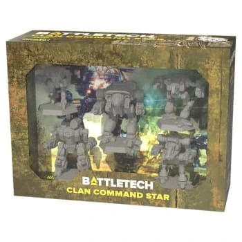 The Clan Command Star includes the Dire Wolf, Summonder, Stormcrow, Mist Lynx, and Shadow Cat -no assembly required- along with five MechWarrior pilot cards and five Alpha Strike cards.